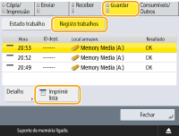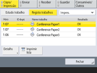 (Contr. estado), será apresentado o ecrã Controlo de estado, que permite verificar o histórico de utilização de cada função, como por exemplo cópia, impressão, envio de correio eletrónico, envio/receção de faxes/I-faxes, etc. A partir deste ecrã também é possível imprimir o histórico de utilização de cada função.![]() |
