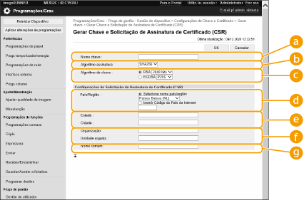 Os certificados gerados nesta máquina não têm uma assinatura da CA, o que pode causar erros de comunicação com alguns pares de comunicação. Para solicitar um certificado com assinatura da CA, são necessários dados de solicitação de assinatura de certificado (CSR). Um utilizador que inicie sessão com privilégios de administrador pode gerar uma CSR.