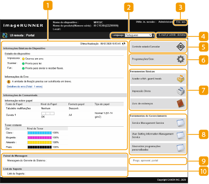 A página do portal mostrada abaixo é apresentada quando inicia sessão na Remote UI (UI Remota). Esta secção descreve os itens apresentados na página do portal e as operações básicas.