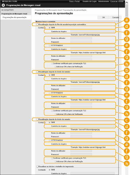Para apresentar os conteúdos após o início do modo de reposição automática, programe <Hora da reposição automática> para um minuto ou mais. Para obter informações sobre os formatos de ficheiro e os tamanhos de dados que podem ser apresentados, consulte Funções de gestão. Esta programação só pode ser efetuada por um utilizador com privilégios de Administrador. Esta programação pode ser importada/exportada. A mesma programação pode ser importada para vários dispositivos (apenas dispositivos Canon que suportem a função Mensagem visual) para apresentar o mesmo aviso ou informação em vários dispositivos. Importar/exportar dados de programações [File Path:] é importado/exportado com esta programação. Se um ficheiro em Caixa avançada estiver especificado e for apresentado na máquina de exportação, efetue uma das seguintes operações: Copie manualmente o ficheiro em Caixa avançada da máquina de exportação para o Caixa avançada da máquina de importação. Altere o [File Path:] para o caminho onde está o ficheiro. Se for efetuar operações de início de sessão, faça-o depois de fechar o ecrã Mensagem visual. Iniciar sessão na máquina Se o Leitor de cartões de cópia estiver ligado, o conteúdo não é apresentado. |