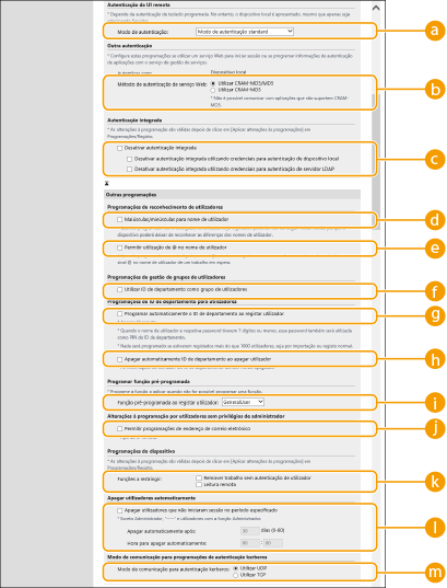 Selecione a caixa de verificação correspondente a [Utilizar a função de autenticação de utilizadores] e especifique as programações necessárias.