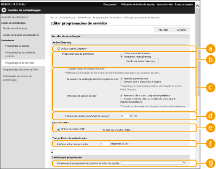 4 | Introduza as informações necessárias. ![]() [Nome do domínio:]Introduza o nome do domínio do Active Directory que corresponde ao destino de início de sessão (exemplo: empresa.domínio.com). [Nome NetBIOS]Introduza o nome do domínio NetBIOS (exemplo: empresa). [Nome do anfitrião principal:] / [Nome do anfitrião secundário:]Introduza o nome do anfitrião do servidor do Active Directory (exemplo: ad-server1). Quando utilizar um servidor secundário, especifique o nome em [Nome do anfitrião secundário:]. [Nome de utilizador:] / [Password:]Introduza o nome do utilizador e a palavra-passe utilizados para aceder e procurar no servidor do Active Directory. [Nome de início de sessão:] / [Apresentado como] / [Endereço de correio eletrónico]Especifique os campos de dados (nomes dos atributos) para o nome de início de sessão, o nome de apresentação e o endereço de correio eletrónico de cada conta de utilizador no servidor do Active Directory (exemplo: sAMAccountName, cn, mail). |