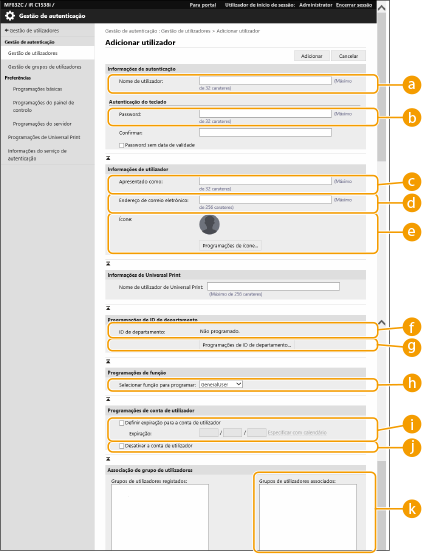 dc | Não | 0 a 32 carateres | Carateres de controlo | - (N/D) | Não pode ser alterado. Será atribuído automaticamente para os seguintes utilizadores. Utilizadores gravados no seguimento de autenticação de servidor |