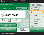 Kontrola celkového počtu zadaných míst určeníV horní části obrazovky je také zobrazen celkový počet zadaných míst určení. To vám umožní před odesláním potvrdit, že je počet míst určení správný. ![]() Odesílání s informacemi odesilateleFax můžete odeslat se jménem a faxovým číslem odesilatele. <ID VYS. terminálu> Kontrola stav odeslaných dokumentůNa obrazovce <Monitor stavu> můžete zkontrolovat stav odeslaných dokumentů. Po kontrole stavů lze z této obrazovky odeslat faxy opětovně nebo zrušit jejich odeslání. Kontrola stavu a výpisu pro odeslané a přijaté dokumenty Je-li možnost <Zobrazit oznámení při akceptování úlohy> nastavena na <On>, lze z obrazovky zobrazené po přijetí úlohy odesílání zobrazit obrazovku <Monitor stavu>. <Zobrazit oznámení při akceptování úlohy> ![]() Když dojde k chybě vysílání z důvodu obsazení linky příjemcePo uplynutí určité doby stroj automaticky provede opakování volby. Nastavení, jako např. počet opakování volby a interval mezi opakováním volby, můžete změnit. <Automatické opakování volby> Tisk hlášení s výsledky odesíláníStisknutím <Volby> <Hlášení o výsledku VYS.> na obrazovce základních funkcí faxování můžete nastavit automatický tisk hlášení s výčtem výsledků odesílání.Pro nastavení u jednotlivých úloh od <Volby> je nutné vybrat <Jen při chybě> nebo <Vyp> v <Hlášení o výsledku VYS.> a potom nastavit <Povolit tisk z Volby> na <Zap>. Pokud jsou fotografie v zaslaném obrazu příliš tmavé nebo pokud nelze odebrat světlé barvy na pozadí barevných originálůKvalita odeslaných obrazů může být zlepšena, pokud budou splněny následující podmínky / nastavení. Typ úlohy: Fax (paměťová odesílání) nebo Skenovat a odeslat (Fax/I-fax) <Vybrat barvu>: <Černá a bílá> (Skenovat a odeslat) <Typ originálu>: <Text> <Sytost> <Sytost pozadí>: <Auto><Rozlišení>: 200 dpi x 400 dpi, 300 dpi x 300 dpi*, 400 dpi x 400 dpi nebo 600 dpi x 600 dpi* *Může být nastaveno na Skenovat a odeslat <Priorita rychl./kvality obrazu pro černobílé skenování> Fax./I-fax. úlohy odesílání: <Priorita kvality> (<Priorita rychl./kvality obrazu pro černobílé skenování>) |