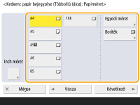 Ha a <Megadás mindig> a <Többcélú tálca alapbeállítások> lehetőségnél a <Kedvenc papír> lehetőségre van állítva, megjelenik egy képernyő, amely lehetővé teszi a „Kedvenc papír” lehetőség használatát, ha betöltötte a papírt a többcélú tálcába. <Többcélú tálca alapbeállítások> |