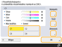 A beállítás után legfeljebb négy beállítást vehet fel. A szín beállítása után nyomja meg a V.hívás/bejegyzés> gombot válasszon a <C1> – <C4> gombok közül nyomja meg a <Bejegyzés> <Igen> <OK> gombot.![]() ![]() Az elmentett beállítások előhívásához nyomja meg a <V.hívás/bejegyzés> lehetőséget, válaszon egy gombot, majd nyomja meg az <OK> gombot. A <C1> – <C4> gombok nevét módosíthatja is. Válassza ki a módosítandó gombot, nyomja meg az <Átnevezés> lehetőséget, és adja meg az új nevet. A bejegyzett beállítások törléséhez válassza ki a gombot , és nyomja meg a <Töröl> <Igen> gombot. |