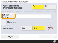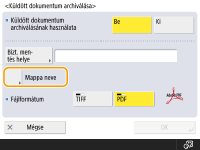 ![]() | Egy előre megadott rendeltetési helyre (e-mail vagy fájlkiszolgáló stb.) menthet egy elküldött faxot. A mentett faxmásolatot a készülék a rendeltetési helytől függően elektronikus formátummá, például PDF-fájllá konvertálja, megőrizve a dokumentumok rendezett és kezelhető jellegét. A módszer egyúttal a naplók egyszerű kezelését is elősegíti, mivel a kiszolgálón a megadott rendeltetési helyen a küldő neve vagy a dátum szerint kategorizált mappa jön létre. |