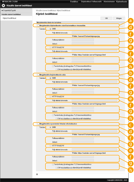 Ha a Vizuális üzenet funkció be van állítva, a tartalom a <Vizuális üzenet> részből is megtekinthető a (Kezdőlap) részben, a fenti időzítéstől függetlenül.Megjelenítendő tartalomként állítson be egy fájlkiszolgálón vagy egy másik, ugyanazon a hálózaton lévő Canon többfunkciós nyomtató Tárhelyén elmentett fájlt. Más készülékek és adathordozók használata Proxykiszolgálón keresztül az interneten található webhelyet is beállíthat tartalomként. Az ehhez a funkcióhoz használt proxybeállítások megegyeznek a <Proxy beállítás> rész beállításaival. A tartalom a nyomtatás megkezdésekor jelenik meg, ha a kényszerítetten tartott nyomtatás engedélyezve van, és a [Display When Print Job Starts] jelölőnégyzet be van jelölve. |