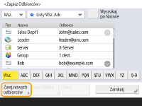Jeżeli serwer LDAP został już zarejestrowany w urządzeniu (Rejestracja serwera LDAP), nie możesz wyszukiwać odbiorców i rejestrować ich w Książce adresowej. Naciśnij kolejno <Ustawienia odbior./przeka.> <Zapisz Odbiorców> <Zarej.nowych odbiorców> <Zapisz z Serw. LDAP> i wyszukaj odbiorców za pomocą polecenia <Wyszukaj po Warunk.>.W sytuacji gdy zarówno nazwa użytkownika, jak i hasło są poprawne, jednak nie ma żadnych wyników wyszukiwania, należy sprawdzić ustawienie godziny na serwerze LDAP i urządzeniu. Jeżeli godzina ustawiona na serwerze LDAP różnic się od godziny ustawionej w urządzeniu o więcej, niż pięć minut, nie można przeprowadzać wyszukiwania. Jeżeli w wynikach wyszukiwania wyświetlanych jest kilku odbiorców, można zarejestrować maksymalnie 256 odbiorców jednocześnie. Informacje, które można otrzymać za pośrednictwem serwera LDAP składają się jedynie z nazw oraz numerów/adresów faksów. W razie konieczności zarejestruj inne informacje przez <Szczegóły/Edytuj>. Nie można jednocześnie wyszukiwać odbiorców na serwerze LDAP zarówno z poziomu panelu sterowania, jak i interfejsu Remote UI (Zdalny interfejs użytkownika). Podczas wyszukiwania odbiorców na serwerze LDAP z poziomu panelu sterowania urządzenia można określić cztery warunki wyszukiwania. Natomiast podczas wyszukiwania odbiorców na serwerze LDAP z poziomu interfejsu Remote UI (Zdalny interfejs użytkownika) można określić tylko jeden warunek wyszukiwania. Może być konieczne wprowadzenie nazwy użytkownika i hasła. Wprowadź nazwę użytkownika i hasło urządzenia, zarejestrowane na serwerze LDAP. Jeśli informacje uwierzytelniające nie są używane, wyszukaj za pomocą pól dla nazwy użytkownika i hasła w interfejsie Remote UI (Zdalny interfejs użytkownika). Określanie/rejestrowanie odbiorców z historii wysyłaniaMożesz określić odbiorców i zarejestrować ich w książce adresowej z poziomu historii wysyłania na ekranie <Monitor stanu>. Ogranicza to wysiłek bezpośredniego wprowadzania adresu, a także pomaga uniknąć wysyłania do nieprawidłowego odbiorcy z powodu wprowadzenia nieprawidłowego adresu. W przypadku określania odbiorcy: (Monitor stanu) <Wyślij> <Rejestr zadania> wybierz odbiorcę, do którego chcesz wysłać <Wprow. jako odbiorca wysył.> <OK>Rejestracja odbiorcy: (Monitor stanu) <Wyślij> <Rejestr zadania> wybierz odbiorcę, którego chcesz zarejestrować <Zarejestruj odbiorcę> zarejestruj odbiorcę z ekranu rejestracji dla każdego typu odbiorcySprawdzanie statusu i rejestru wysłanych i odebranych dokumentów Sprawdzanie statusu i rejestru zeskanowanych dokumentów |