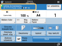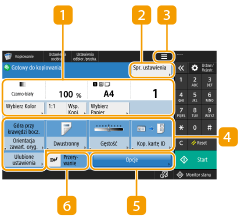 Wyświetla status ustawień, takich jak proporcja kopiowania, format papieru i liczba kopii. Upewnij się, że potwierdzono ustawienia, aby rozpocząć prawidłowy proces kopiowania. Aby zmienić ustawienia, należy nacisnąć na przycisk znajdujący się pod wyświetlaną sekcją.