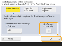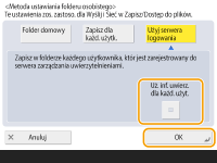 3 | Wybierz informacje do uwierzytelniania i naciśnij na <OK>. Aby korzystać z osobnej nazwy użytkownika i hasła dla katalogu prywatnego, naciśnij na <Uż. inf. uwierz. dla każd. użyt.>, aby dodać znacznik. Usuń znacznik, aby korzystać z tej samej nazwy użytkownika i hasła wprowadzonego podczas logowania. Jeżeli do tego elementu dodany zostanie znacznik, nazwa użytkownika i hasło należy zarejestrować dla każdego z użytkowników. ![]() Wewnątrz folderu macierzystego tworzony jest folder, o następujących nazwach. Jeśli do opcji <Uż. inf. uwierz. dla każd. użyt.> jest dodany znacznik wyboru: nazwa użytkownika określona przez użytkownika Jeśli do opcji <Uż. inf. uwierz. dla każd. użyt.> nie jest dodany znacznik wyboru: nazwa użytkownika używana do zalogowania się |
