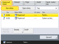 Ak na ovládacom paneli stlačíte tlačidlo (Stop), keď úlohy kopírovania čakajú na vykonanie, všetky úlohy kopírovania sa pozastavia a zobrazí sa správa <<Stop>Vyberte kopír. úlohu, ktorú chcete zrušiť.> a zoznam úloh kopírovania. Môžete vybrať úlohu kopírovania zo zoznamu a stlačením tlačidla <Zrušiť> môžete danú úlohu kopírovania zrušiť. Ak chcete obnoviť kopírovanie, stlačte tlačidlo <Obnoviť kopírov.>. |