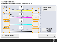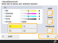 Po úprave môžete zaregistrovať maximálne štyri nastavenia. Po úprave farby stlačte tlačidlo <Vyvolať/Uložiť> vyberte jedno z tlačidiel <C1> až <C4> stlačte tlačidlo <Uložiť> <Áno> <OK>.![]() ![]() Ak chcete vyvolať uložené nastavenia, stlačte tlačidlo <Vyvolať/Uložiť>, vyberte jedno z tlačidiel a stlačte tlačidlo <OK>. Názvy tlačidiel <C1> až <C4> môžete zmeniť. Vyberte tlačidlo, ktoré chcete zmeniť, stlačte tlačidlo <Premenovať> a zadajte nový názov. Ak chcete vymazať uložené nastavenia, vyberte tlačidlo stlačte tlačidlo <Zmazať> <Áno>. |