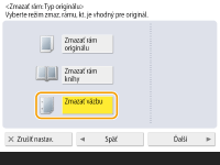1 | Stlačte tlačidlo <Zmazať rám knihy> a potvrďte <Veľ. originálu>. ![]() Ak sa formát zobrazený v poli <Veľ. originálu> líši od formátu knihy, ktorý ste nastavili, stlačte tlačidlo <Zmeniť> a vyberte formát. |