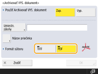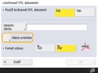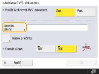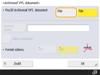 Ak nastavíte položku <Archivovať VYS. dokument> na možnosť <On>, nemôžete vykonávať priame odosielanie. Toto nastavenie sa automaticky prepne do stavu <Vyp.> v nasledujúcich prípadoch. Podľa potreby znova špecifikujte miesto určenia alebo zmeňte nastavenie späť na stav <Zap.>. V prípade vymazania miesta určenia z adresára. V prípade importu adresára z položky Importovanie alebo exportovanie údajov nastavení Remote UI (Vzdialené PR). V prípade prijatia adresára zo softvéru na správu adresára. <Import/Export zo softvéru na správu adresára> |