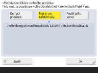 Zaregistrovanie osobného priečinka a overovacích údajov jednotlivých používateľovAk je pod položkou <Metóda špecifikácie osobného priečinka> nastavená možnosť <Registrovať pre každého užívateľa>, zaregistrujte ako osobný priečinok pre každého používateľa jeden z nasledujúcich priečinkov. Bez ohľadu na to, kde toto nastavenie nakonfigurujete, sú zaregistrované nastavenia rovnaké a zaregistruje sa ten istý osobný priečinok. <Skenovať a odoslať> <Uložiť/Upraviť informácie pre každého užívateľa> <Osobný priečinok><Skenovať a uložiť> <Sieť> <Uložiť/Upraviť informácie pre každého užívateľa> <Osobný priečinok><Prejsť k uloženým súborom> <Sieť> <Uložiť/Upraviť informácie pre každého užívateľa> <Osobný priečinok> |