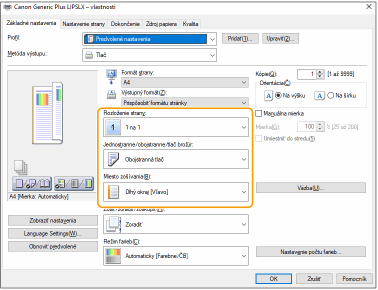 3 | Počas kontroly náhľadu tlače nastavte položku [Rozloženie strany] [Poradie strán] [Jednostranne/obojstranne/tlač brožúr] [Miesto zošívania]. |