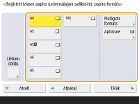 Ja opcija <Vienmēr norādīt> iestatījumos <Universālā paliktņa noklusējumi> ir iestatīta uz <Izlases papīrs>, tiek parādīts ekrāns, kurā jūs varat izvēlēties izlases papīru, kad ievietojat papīru daudzfunkciju papīrturī. <Universālā paliktņa noklusējumi> |