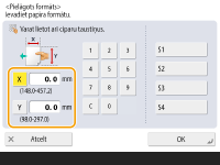 Nospiediet <X> vai <Y>, lai ievadītu katras malas garumu, izmantojot ciparu taustiņus. ![]() Jūs varat izmantot pogas <S1>–<S4>, lai reģistrētu bieži izmantotu papīra formātu un to izsauktu ar vienu pieskārienu. Brīva formāta papīra reģistrēšana (pielāgota formāta papīrs) | |