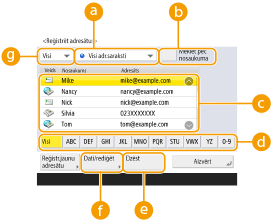 Pirmā burta pogaIzvēlieties adresāta nosaukuma pirmo burtciparu rakstzīmi. Nospiediet <Visi>, lai tiktu parādīti visi reģistrētie adresāti.
