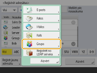 ![]() | Vairākus adrešu grāmatā reģistrētus adresātus (Adresātu reģistrēšana adrešu grāmatā) var apvienot grupā. Šo iespēju varat izmantot, lai vienlaikus nosūtītu dokumentus un dublētu datus, jo dažādu veidu adresātus var reģistrēt vienā grupā. Piemēram, e-pasta adreses un failu serveru IP adreses varat reģistrēt vienā grupā. |