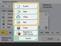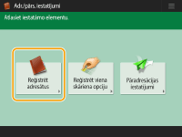 ![]() | Adrešu grāmatā varat reģistrēt saņēmēja faksa numuru vai e-pasta adresi, kas var tikt izmantota, sūtot skenētus dokumentus. Turklāt adrešu grāmatā kā adresātu varat reģistrēt interneta faksa adresātu, failu servera mapes atrašanās vietu (IP adrese un ceļš) un Canon daudzfunkciju printera krātuvi Izvērstā telpa). |