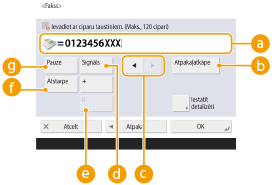 1 | Ievadiet faksa numuru. ![]() Faksa numura lauksIevadiet faksa numuru, izmantojot ciparu taustiņus. Izmantojiet pogas – , ja nepieciešams <Atsolis> Citu pēc cita izdzēsiet ciparus, kas faksa numura laukā atrodas pa kreisi ( ).![]() /![]() Nospiediet, lai pārvietotu kursoru faksa numura laukā ( ) pa kreisi vai pa labi. <Signāls>Nospiežot šo pogu, tiks ievietota rakstzīme “T” (signāls). Pat ja izmantojat impulsu sistēmu, cipari, kas atrodas aiz “T”, tiks nosūtīti, izmantojot signālu. Taustiņš <R>Ja iekārta ir pievienota pie PBX (privātā atzara centrāle), pirms adresāta ievadīšanas nospiediet šo pogu. Ja šī poga nav pieejama, reģistrējiet taustiņa R iestatījumus. <R taustiņa iestatījums> <Atstarpe>Ievadiet atstarpi starp cipariem, lai tos būtu vieglāk lasīt. <Pauze>Nospiežot šo pogu, tiks ievietota rakstzīme “P” (pauze). Sūtot faksa ziņojumu uz ārzemēm, pēc starptautiskā piekļuves koda vai faksa numura ievietojiet pauzes. Tas palīdz uzlabot savienojumu. ![]() Pauzi nevar ievadīt pirms numura. |