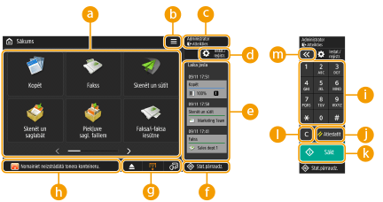 Šīs pogas ļauj atvērt pamatfunkciju ekrānus, piemēram, Kopēt un Skenēt un sūtīt.