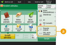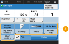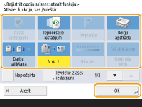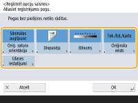Pamatfunkciju ekrānā novietoto iestatījumu vienumu skaits un parādāmā atrašanās vieta atšķiras atkarībā no funkcijām. Īsinājumpoga netiek parādīta, ja iestatījums <Nepiešķirta> ir iestatīts kā saīsne. Maksimālais iestatījumu <Opcijas> saīšņu skaits, ko varat reģistrēt, ir norādīts tālāk. Kopēšana: 5 Fakss: 4 Skenēšana un sūtīšana: 2 |