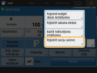 Reģistrēšana iestatījumos <Izlases iestatījumi>Iestatījumos <Izlases iestatījumi> vara reģistrēt bieži izmantotās kopēšanas procedūras, kā arī bieži norādītos skenēšanas adresātus un iestatījumus. Papildinformāciju sk. sadaļā Bieži izmantoto funkciju kombinācijas reģistrēšana. Noklusējuma iestatījuma mainīšana pamatdarbību ekrānāKad katras funkcijas iestatījumi ir mainīti, pamatdarbību ekrānā varat reģistrēt pašreizējos iestatījumus kā noklusējuma iestatījumus, nospiežot un pēc tam nospiežot <Mainīt noklusējuma iestatījumus>. Ja pirms šā iestatījuma veikšanas iekārtā piesakāties, izmantojot personu autentifikācijas pārvaldību (Pieteikšanās iekārtā), tas tiek reģistrēts kā jūsu personalizētais noklusējuma iestatījums (Personalizējamu vienumu saraksts). |