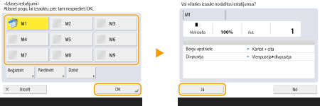 Kopēšanas/skenēšanas un sūtīšanas funkcijai iekārtu varat iestatīt arī tā, lai netiktu parādīts apstiprinājuma ekrāns, kad atkārtoti tiek izsaukti reģistrētie iestatījumi.