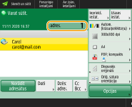 Nospiediet <I-faksa adrese>, ievadiet adresātu un nospiediet <OK>. Adresāts ir jānorāda šādā formātā: adv01@example.com. Lai sūtītu uz iekārtu tajā pašā tīklā, ievadiet adresātu šādā formātā: adv01@192.168.11.100 (saņēmēja vārds@IP adrese).