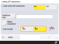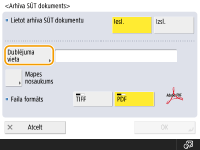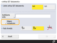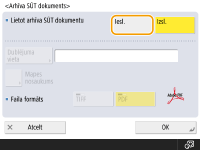 Tiešā sūtīšana nav iespējama, ja <Arhīva SŪT dokuments> ir iestatīts kā <On>. Šis iestatījums automātiski pārslēdzas uz stāvokli <Izsl.> šādos gadījumos: Norādiet adresātu vēlreiz vai atgrieziet iestatījumu stāvoklī <Iesl.> pēc nepieciešamības. ja rezerves adresāts ir dzēsts no adrešu grāmatas; ja adrešu grāmata ir importēta no attālā lietotāja interfeisa (Remote UI) Iestatījumu datu importēšana/eksportēšana; ja adrešu grāmata ir saņemta no adrešu grāmatas pārvaldības programmatūras. <Importēt/eksportēt no adr. grāmatas pārv. programm.> |