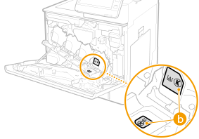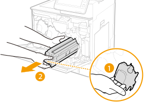 Nemainiet tonera kasetnes agrāk, nekā ir parādījies paziņojums ar uzaicinājumu to darīt. Vienmēr turiet tonera kasetni aiz tās roktura. Lai nenoskrāpētu veltņa virsmu (  ) iekārtā un nepakļautu to gaismas iedarbībai. Nepieskarieties elektriskajiem kontaktiem (  ) vai tonera atmiņai (  ). |