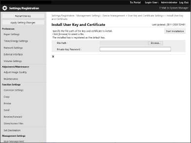 ![]() | Atslēgu un sertifikātu (ierīces sertifikātu), kas nepieciešami, pievienojot ierīces parakstu, var reģistrēt, izmantojot attālo interfeisu. Nozīmējiet administratoru šo vienumu reģistrēšanai. Tiklīdz tie ir reģistrēti, lietotāji, kuri piesakās, izmantojot personīgo autentifikāciju, var pievienot digitālo parakstu skenētiem dokumentiem, kas tiek nosūtīti konkrētā faila formātā. Ciparparaksta pievienošana |