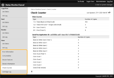 Jūs varat pārbaudīt dažādu iekārtas informāciju, piemēram, informāciju par kļūdām, atlikušā papīra un tonera daudzumu, informāciju par pievienoto papildaprīkojumu un kopējo līdz šim izdrukāto lapu skaitu.