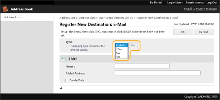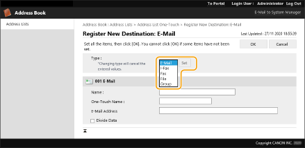 3 | Izvēlieties adresāta veidu un noklikšķiniet uz [Set]. ![]() |