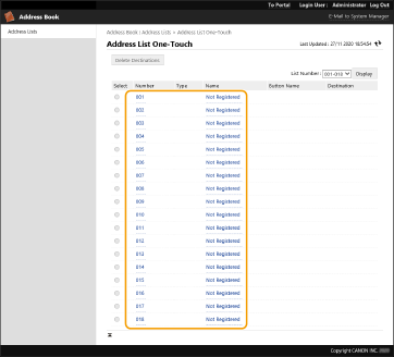 2 | Noklikšķiniet uz [Not Registered] vai uz nereģistrētu viena pieskārien pogu. [Not Registered] tiek parādīta [Name] attiecībā uz nereģistrētām viena pieskāriena pogām. Lai parādītu viena pieskāriena pogas, kas nav redzamas sarakstā, izvēlieties skaitļu diapazonu sadaļā [List Number], tad noklikšķiniet [Display]. ![]() |