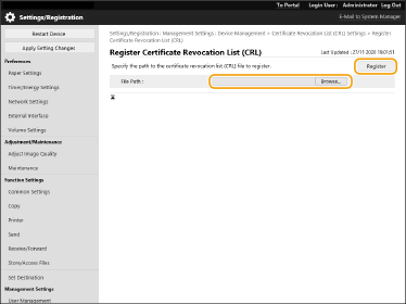 Noklikšķiniet uz [Browse...], norādiet reģistrējamo failu (CRL) un noklikšķiniet uz [Register].