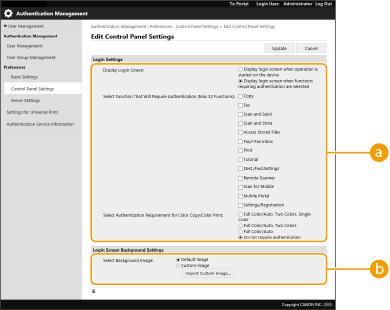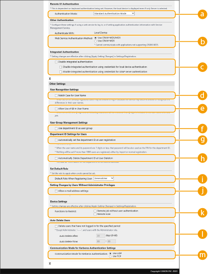 Atzīmējiet autentifikācijas režīmu, kas izmantojams pieteikumam attālajā interfeisā. Ja ir atzīmēts[Guest Authentication Mode], nereģistrēti lietotāji var arī pieteikties, noklikšķinot uz [Log In (Guest)]. Atzīmējiet [Administrator Authentication Mode], ļaujot pieteikties tikai lietotājiem ar administratora tiesībām.
