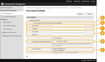 Veicot pilnīgu importu, visi lietotāji, kas nav uzskaitīti importētajos failos, tiek izdzēsti no iekārtas. Taču "-----" un "Administrator", kas ir reģistre'ti pēc noklusējuma, saglabāsies pat, ja tie nav iekļauti importētajos failos.