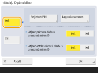 Pārliecinieties, ka iekārtā reģistrētajiem lietotājiem ir uzstādīti nodaļu ID. Lietotāja informācijas reģistrēšana vietējā ierīcē Nodaļu ID pārvaldība ir spēkā tikai attiecībā uz tiem lietotājiem, kuri ir reģistrēti vietējā ierīcē. Ja piesakāties kā lietotājs ar administratora tiesībām, automātiski tiek piešķirts sistēmas pārvaldnieka ID un PIN un tas tiek pārvaldīts kā nodaļas ID. Ja nodaļu ID pārvaldība tiek aktivizēta, izmantojot Karšu kopēšanas lasītājs, izmanto kartēm piešķirtos nodaļu ID. Tādēļ nav iespējams reģistrēt nodaļu ID. |