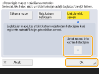 2 | Atzīmējiet izmantojamo autentifikācijas informāciju un nospiediet <OK>. Lai izmantotu atsevišķu lietotājvārdu un paroli personīgajai mapei, nospiediet <Lietot autent. info katram lietotājam>, lai pievienotu kontrolzīmi. Noņemiet kontrolzīmi, lai izmantotu to pašu lietotājvārdu un paroli, kuru izmanto, lai pieteiktos. Ja šim vienumam tiek pievienota kontrolzīme, katram lietotājam jāreģistrē lietotājvārds un parole. ![]() ![]() Autentifikācijas informāciju, kas nepieciešama, lai piekļūtu personīgajai mapei (lietotājvārds un parole), nevar izgūt no Active Directory. Ja ir atlasīts <Lietot autent. info katram lietotājam>, lietotājvārds un parole, lai pieteiktos iekārtā ar tastatūras autentifikāciju, tiek reģistrēti kā autentifikācijas informācija, lai piekļūtu personīgajai mapei. ![]() Ir jāizmanto pieteikšanās pakalpojums, kas atbalsta šo funkciju. Sīkāku informāciju jautājiet izplatītājam vai servisa pārstāvim. Ja izmantojat lietotāja autentifikāciju, konfigurējiet mapi "homeDir”, kas ir lietotāja atribūts aktīvajā direktorijā, izmantojot "\\host name\folder path" (resursdatora nosaukums\mapes ceļš) formātu. |
