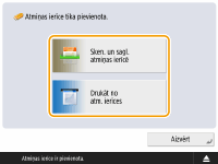 Pieejamo funkciju īsceļa parādīšana, pievienojot atmiņas ierīciIzvēlieties opcijas <Atlasīt opciju, kad tiek pievienota atmiņas ierīce> iestatījumu <Iesl.>. Kad atmiņas ierīce ir pievienota, tiek parādīts ekrāns, kas līdzīgs attēlā redzamajam, un var nekavējoties aktivizēt atbilstošās funkcijas. <Atlasīt opciju, kad tiek pievienota atmiņas ierīce>*Lai parādītu īsceļus, pirms atmiņas ierīces pievienošanas atceliet miega režīmu. Iziešana no miega režīma |
