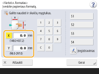Paspauskite <X> arba <Y>, kad skaičių mygtukais įvestumėte kiekvienos kraštinės ilgį. ![]() Jeigu dažnai naudojamo popieriaus formatą susiejate su mygtukais <S1>–<S4>, galite iškviesti juos vienu paspaudimu. Nestandartinio formato (pasirinktinio formato) popieriaus registravimas | |