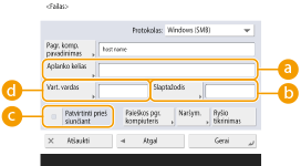 1 | Įveskite failų serverio pagrindinio kompiuterio, kuriuo perduodami duomenys, pavadinimą / Išplėstinė sritis. ![]() Paprašykite tinklo administratoriaus suteikti informacijos apie failų serverį / Išplėstinė sritis. <Protokolas>Pasirinkite protokolą failų serveriui iš <Windows (SMB)>, <FTP> ir <WebDAV>. Siųsdami dokumentą į Išplėstinė sritis, pasirinkite <Windows (SMB)> arba <WebDAV>. ![]() Pasirinkus <Windows (SMB)>, rodomi mygtukai <Paieškos pgr. kompiuteris> ir <Naršymas>. Jūs galite lengvai nurodyti failų serverį / Išplėstinė sritis atlikdami paiešką ar peržiūrėdami tinklą. Galite naudoti <Naršymas> tik tuomet, kai nustatysite <1.0> į <Įjungt.> nuėję į <SMB kliento versijos nurodymas>. Jūs galite registruoti iki penkių katalogų serverių, naudojamų <Naršymas>. <Pagr. komp. pavadinimas>Įveskite failų serverio pagrindinio kompiuterio pavadinimą / Išplėstinė sritis. Jei kaip protokolą pasirinkote <FTP>, įveskite <pagrindinio kompiuterio pavadinimas>, kaip nurodyta toliau. Kai TLS yra išjungtas Pavyzdys: Jei norite išsaugoti bendrai naudojamoje vietoje: ftp://<pagrindinio kompiuterio pavadinimas>/bendrinimas Jei norite išsaugoti asmeninėje vietoje: ftp://<pagrindinio kompiuterio pavadinimas>/vartotojai Kai TLS yra įjungtas Pavyzdys: Jei norite išsaugoti bendrai naudojamoje vietoje: ftps://<pagrindinio kompiuterio pavadinimas>/bendrinimas Jei norite išsaugoti asmeninėje vietoje: ftps://<pagrindinio kompiuterio pavadinimas>/vartotojai Siųsdami dokumentą į Išplėstinė sritis, įveskite <Pagr. komp. pavadinimas> toliau nurodyta tvarka. Jei protokolui pasirenkate <Windows (SMB)> Pavyzdys: Jei norite išsaugoti bendrai naudojamoje vietoje: \\192.168.100.50\share Jei norite išsaugoti asmeninėje vietoje: \\192.168.100.50\users Jei protokolui pasirenkate <WebDAV>, įveskite <Pagr. komp. pavadinimas>, kaip nurodyta toliau, ir paspauskite <Toliau>. Kai TLS yra išjungtas Pavyzdys: Jei norite išsaugoti bendrai naudojamoje vietoje: http://<IP adresas arba pagrindinio kompiuterio pavadinimas>/ Jei norite išsaugoti asmeninėje vietoje: http://<IP adresas arba pagrindinio kompiuterio pavadinimas>/ Kai TLS yra įjungtas Pavyzdys: Jei norite išsaugoti bendrai naudojamoje vietoje: https://<IP adresas arba pagrindinio kompiuterio pavadinimas>/ Jei norite išsaugoti asmeninėje vietoje: https://<IP adresas arba pagrindinio kompiuterio pavadinimas>/ <Ryšio tikrinimas>Įvedę pagrindinio kompiuterio pavadinimą, paspauskite šį mygtuką ryšiui su failų serveriu / Išplėstinė sritis patvirtinti. ![]() Jei naudojatės įsiregistravimo paslauga, pavyzdžiui, tapatybės patvirtinimo valdymu, būtina įvesti <Vart. vardas> ir <Slaptažodis>. |