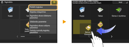 Peržiūrėti funkcijos gidąPaspauskite <Vadovėlis>, kad iškviestumėte ekraną, kuriame susipažinsite, kaip naudotis aparato funkcijomis, taip pat gausite patarimų dėl kopijavimo, nuskaitymo ir t. t. Peržiūrėkite šį ekraną, kai norėsite daugiau sužinoti apie esamas funkcijas bei kaip jomis naudotis. ![]() Pavyzdys: Kopijavimo funkcijų mokomoji priemonė Pasirenkant elementą iš sąrašo rodomas mokomasis ekranas. ![]() Naudoti Pagalbos funkcijąPriklausomai nuo to, kokia funkcija rodoma, kartais rodomas viršutiniame dešiniajame ekrano kampe. Paspauskite , kad pažymėtumėte aprašą ir funkcijos operacijos metodą.![]() Paspauskite <Baigti>, jei norite grįžti į ankstesnį ekraną. Valdykite taip, kaip išmanųjį telefoną (brūkštelėkite / nuvilkite ir numeskite).Kai kuriuose ekranuose galite perjungti puslapį ar slinkti juo brūkštelint ekranu viršun / žemyn arba kairėn / dešinėn taip, kaip išmaniajame telefone. ![]() ![]() Taip pat galite išjungti brūkštelėjimo operacijas. <Vald. funkcijos naudojimas> Brūkštelėjimo ir nuvilkimo bei numetimo veiksmų negalima naudoti, kai <Ekrano spalvų sukeitimas> nustatytas į <Įjungt.>. <Ekrano spalvų sukeitimas> Ekranuose su judančiais mygtukais mygtukus galima perkelti nuvelkant ir numetant. ![]() |
