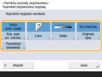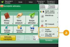 Parametrų mygtukus, rodomus pagrindinių funkcijų ekrane (kopijavimo, faksogramų siuntimo ir nuskaitymo užduotims), galite pakeisti kitais mygtukais punkte <Parinktys>. Pagrindinių funkcijų ekrane rasdami dažnai naudojamų parametrų mygtukus galėsite veiksmingiau pasinaudoti funkcijomis. Be to, jei prisijungiama naudojantis tapatybės patvirtinimo valdymu, galima rodyti skirtingą pagrindinių funkcijų ekraną, pritaikytą kiekvienam vartotojui.
