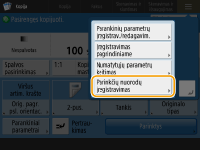 Kopijavimo funkcijai galite registruoti sukonfigūruotus parankinius parametrus kaip sparčiuosius klavišus iš <Iš anksto nustat. parankin. param.>.