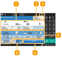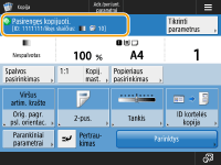 Rodoma parametro būsena, pavyzdžiui, kopijų mastelis, popieriaus dydis ir kopijų skaičius. Norėdami tinkamai nukopijuoti, būtinai patvirtinkite parametrus. Norėdami pakeisti parametrus, paspauskite mygtuką, esantį žemiau ekrano. Pagrindiniai kopijavimo veiksmai